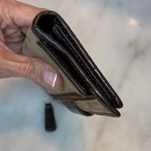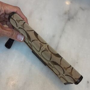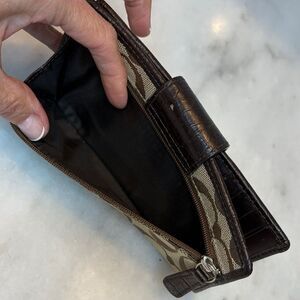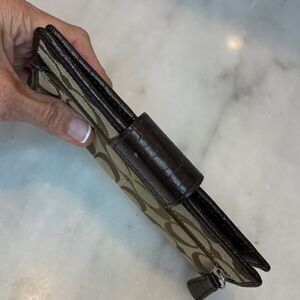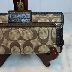 Authentic Y2K Coach Jacquard Signature Logo Canvas Snap Closure Compact Wallet in EUC. Brown and silver emblem on the front snap closure. Brown reptile embossed leather accent. Zipper compartment on the back side of the wallet. Chocolate brown smooth leather interior with card slots, ID slot and cash slots. Approximate measurements - 6.75" x 3.5" Photos are the most accurate description of this classic vintage Coach wallet. Ask questions and make an offer!