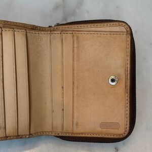 Authentic designer Coach Y2K Jacquard Signature Logo Canvas Striped Compact Wallet is preowned. This classic wallet is a must have for any Coach enthusiast. The timeless tan/brown signature logo and tan leather accents is perfect to match your Y2K bags!! Snap closure opens to leather compartment with card slots and cash slot. Leather needs conditioning and has some scratches. Zipper compartment opens accordion style with two compartments. Approximate measurements - 4.5" x 3.75" Photos are the most accurate description of this vintage wallet. Ask questions and make an offer!