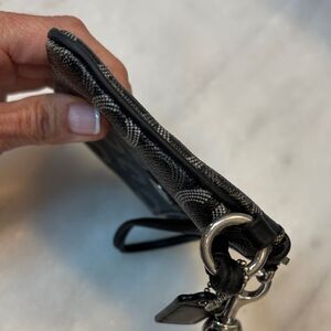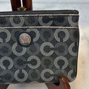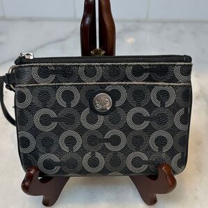 Authentic Coach Waverly Opt Art Dotted Saffiano Leather Pouch Clutch Wristlet is preloved. ! Op Art signature "C" logo in gray and silver. Coach Signature Opt Art Logo script signature print subtly covers the wristlet for added style. Interior lilac sateen fabric needs a cleaning. Slip pocket on the front of the pouch. See photos for detailed description. Silver hardware & zipper are all in excellent working condition. Small black hangtag included. Approx. 6"x4" Zoom on photos, ask questions and Make me an offer!!!!