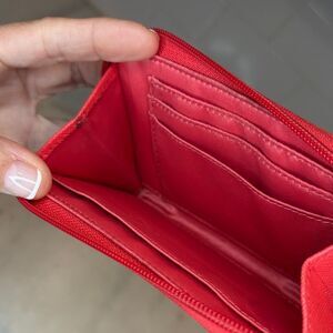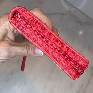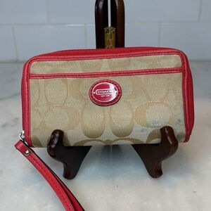 Authentic designer Coach Y2K Jacquard Signature Logo Neon Leather Wristlet Wallet is preowned. Tan/tan signature logo canvas covers the wallet. Trimmed with neon reddish/pinkish leather piping. Blue smudge on canvas needs to be spot cleaned. Priced accordingly. Slip pocket on the front of the wallet for easy access. Wristlet strap in matching leather color. Zip around opens to accordion style interior in matching leather. Two card slots and a cash slot. Compact but great for carrying everything you could possibly need. Approximately 6" x 3.5" Photos are the most accurate description of this fun, colorful, vintage wallet. Zoom on photos, ask questions and make an offer!