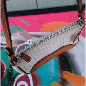 Rare 2000s Coach demi bag with a blue and pink plaid design on canvas and british tan colored leather bottom, top handle, hangtag, trim and zipper pull. Features a zip top closure and interior slip pocket.