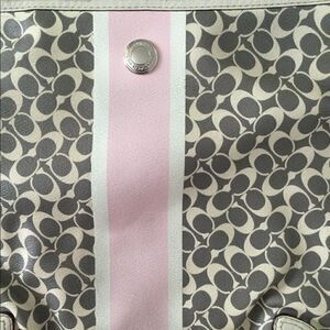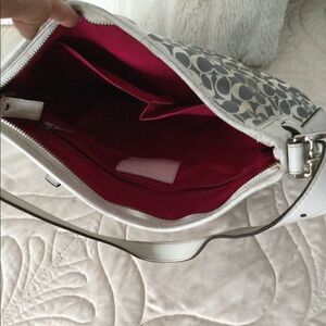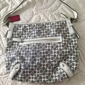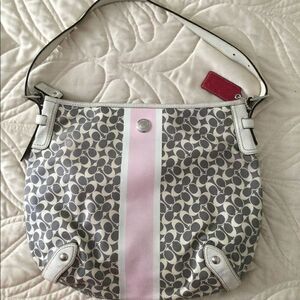 Coach bag, 14x12 grey, white, soft pink, hobo type purse, zipper closure, lined, inside and outside pockets, silver hardwear details, adjustable straps, usual wear, some minor scuffs and marks, no holes.
