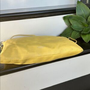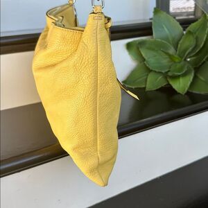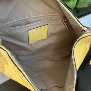 This sunshine, yellow, bright, genuine, leather shoulder bag is soft and luxurious to the touch and has the coach name in Boston and Silvertone lettering on the bottom front. The detachable shoulder strap is comfortable to carry and has no cracks or feeling. The strap has an approximate 23 inch drop. The leather on this bag is very beautiful and with some TLC.(pol-ish) good luck even more “perfect”. There is a matching coach hang tag attached and a strong and secure a zipper at the top. The bag opens to a light tan fabric lining with only a few random ink marks and signs of use. The coach creed is inside with number 29461 this purse measures approximately 14.75 inches across and stands approximately 10.25 inches tall. Non-smoking and perfect no matter this season.