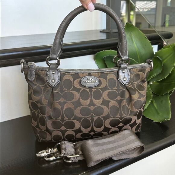 This Coach purse is a great neutral, coloring and easy to grab and go. The Signature fabric has no holes or scuffs. Coach horse and carriage logo on the front top center with rolled shoulder straps and a removable Crossbody strap that matches well but is not the original Crossbody strap. The matching strap is easy to carry and is approximately 46 inches long.