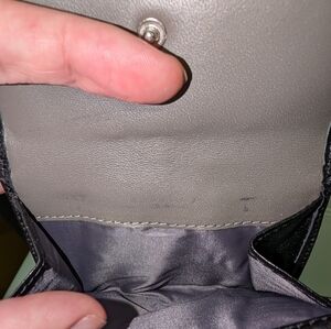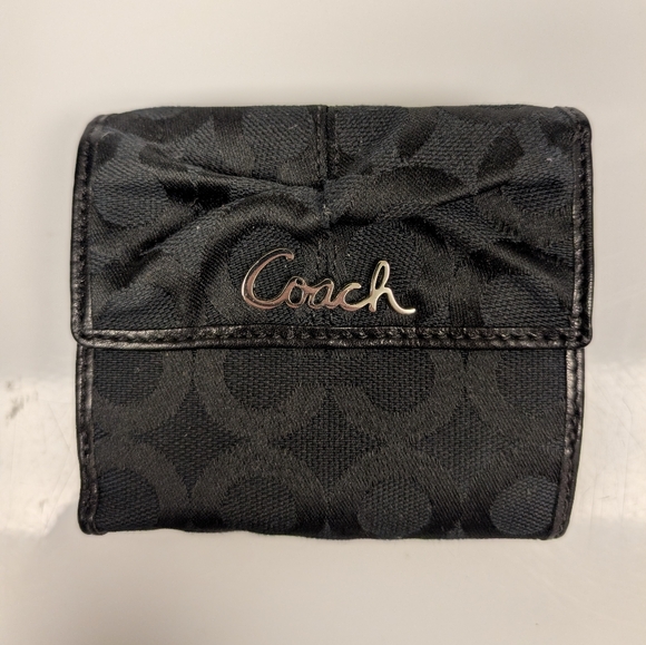 Coach small black bow crinkle wallet. One indent on gray interior, small black marks on creaseline of coin pocket. Estate sale.