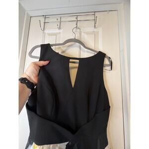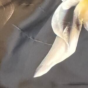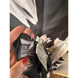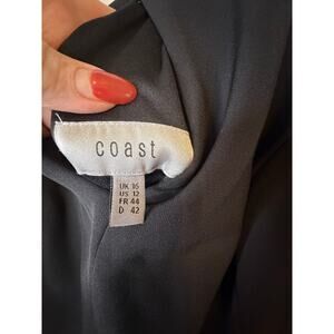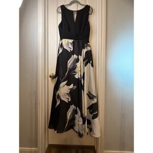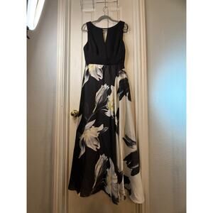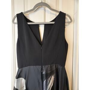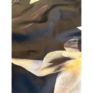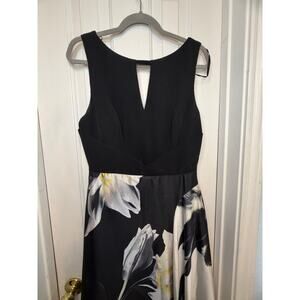 Elegant Coast black floral dress featuring a beautifully tailored sleeveless bodice with a flattering V-neckline and structured seams for a polished fit. The fitted black top flows into a stunning silky, full A-line skirt adorned with a bold oversized floral print in soft ivory and subtle yellow tones, creating dramatic movement and visual impact. Designed with a fully lined interior for comfort and coverage and finished with a hidden back zipper closure for a smooth, secure fit. Please note there is a small area where there appear to be a few minor runs in the fabric (see photos). This is hardly noticeable when viewing the dress as a whole, and aside from this, the dress is in great overall condition. The contrast between the sleek bodice and flowing skirt makes this piece perfect for weddings, cocktail events, evening occasions, or special celebrations. Colors and measurements may vary slightly due to lighting, screen settings, or AI-generated rendering.