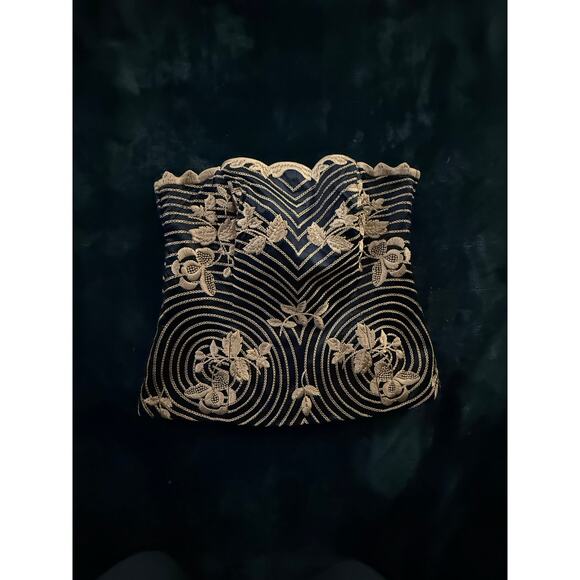 Elegant Coast bustier featuring intricate gold embroidery on a deep navy base. This piece has a structured corset-style silhouette with a scalloped neckline and striking Art Deco inspired swirl stitching layered with floral detailing. Fully lined with a smooth acetate interior for comfort and structure.