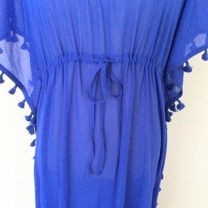 This lovely swim coverup is full length in a cobalt blue semi-sheer fabric. The waist is drawstring with elastic in the back. The sleeves are dolman and the tassels run from the sleeves to the bottom hem. This could also be worn over leggings and a tank top. The approximate measurements are: