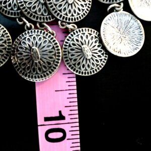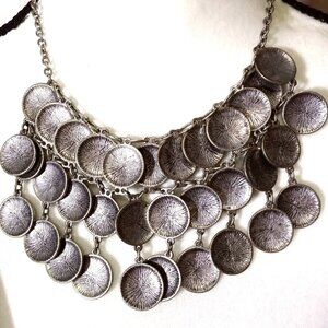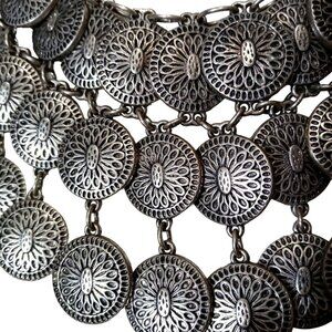 Silver-toned statement necklace featuring multiple circular coin style medallions. These medallions are linked together and dangle from a chain, creating a layered effect. Each medallion is intricately designed with a floral or sunburst pattern, adding a decorative element to the piece.