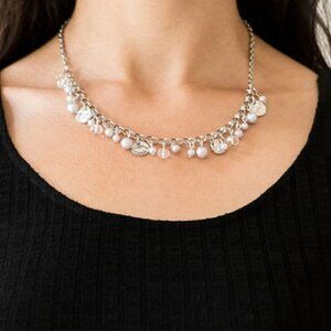 Pearly silver beads, smoky crystal-like gems, and hammered silver discs swing from a bold silver chain, creating a refined fringe below the collar. Features an adjustable clasp closure.