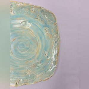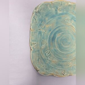 Add a touch of the beach to your home decor with this handmade ceramic plate. The plate features a light blue color and starfish and seashell marks, giving it a beachy feel. Perfect for displaying as a decorative piece or using to hold small items, this plate is a great addition to any room. The plate is made of high-quality ceramic, ensuring its durability and longevity. Use it to enhance the look of your home or as a thoughtful gift for someone who loves the ocean.