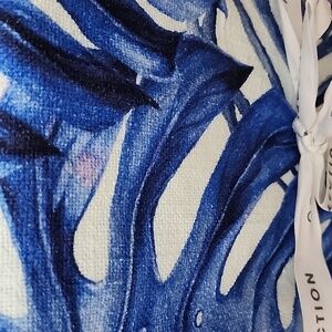 "Coastal Collection" Throw Blanket has a prominent botanical leaf design in rich shades of blue on a white background. The bottom of the throw features tassels in a matching white, adding a textural element to the piece. This throw is suitable for adding a touch of elegance and coastal touch to a room.