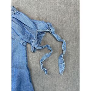 Lightweight chambray-style off shoulder top with a stretchy neckline and feminine tie sleeves. Button-front detail and curved hem create a flattering, casual silhouette. Ideal for summer festivals, coastal vacations, or easy everyday styling. A few small white marks are visible in spots, but do not affect wearability.