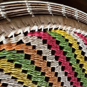 Vibrant, beautiful and truly unique hand woven basket featuring a shell edge. Bright Multicolor design. Sturdy and well made.