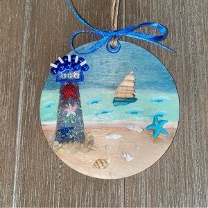 Bring a touch of the seaside to your holiday decor with this charming coastal lighthouse ornament. Featuring vibrant blue and red hues, it's perfect for adding a nautical flair to your celebrations. Made from North Topsail Beach finds. Bring the beach home.