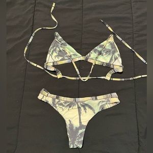 Previously owned in is worn, lightly lined, bottoms are VERY revealing. Small stain on back of bottoms (copper/brown color, not sure what it’s from but it kind of matches!), no staining in seat area.