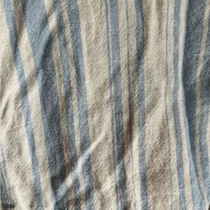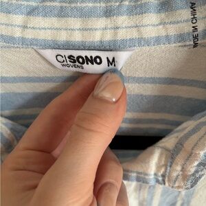 Casual button-down with blue and white stripes. Soft fabric being a linen blend. Ideal for relaxed outings paired with high waisted pants or a white skirt.