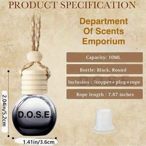 Coastal Waters Car Diffuser – Natural Refillable Air Freshener Refresh your car, home, or office with the calming Coastal Waters car diffuser by D.O.S.E. This elegant, refillable glass air freshener uses a wooden cap for natural, long-lasting scent diffusion—no plugs, no sprays, no toxins. Perfect for use in your car or workspace, this natural air freshener delivers a clean, sweet coastal scent that helps you relax and reset. Simply tip the bottle to control fragrance intensity. Refillable hanging glass diffuser Toxin-free, no artificial additives Long-lasting Coastal Waters fragrance Directions included in package. Designed by Department Of Scents Emporium (D.O.S.E.). 🛑Clean any spillage immediately and do not allow diffuser to lean and waste. Keep away from children and pets.