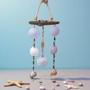 New without tags, Handcrafted natural driftwood, sand dollars, and seashells Wind Chime/hanging mobile. It has blue chipped beads with stainless steel dolphins, shells, and starfish beads. Natural sea glass is on the Driftwood for extra eye catching sparkle. Can also be a wall hanging decor. It does not actually chime and is for coastal decor. As with anything made by nature, there will be normal minor imperfections. The pictures are of the actual item. Measures 8.5" W x 20"L. The handle is 5.5" L and total length is 20" (including Handle)