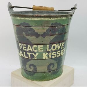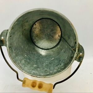 Attached is a metal handle for hanging. The pail is made from metal, and the interior has white distressing upon the bottom.