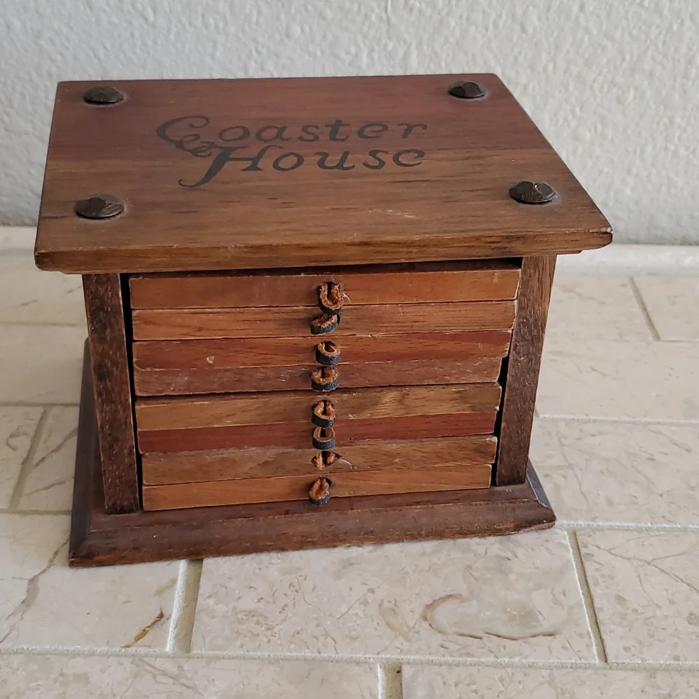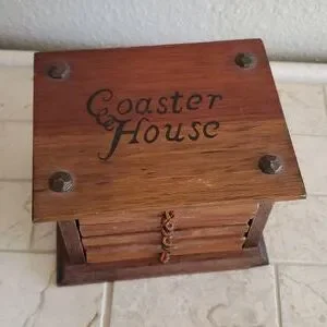 Quirky set of 8 coasters in their own wooden house. This is in good condition but one coaster is missing its leather loop.