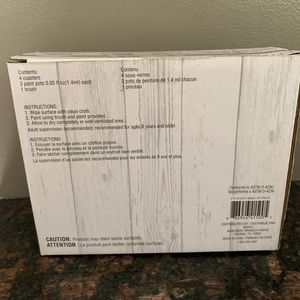 Coaster making kit. The kit includes 4 coasters, a small paintbrush, and yellow, pink, and blue paints. It is new in package, but the paints look a little sparse and could be drying up. The coasters would work perfect with other paints.