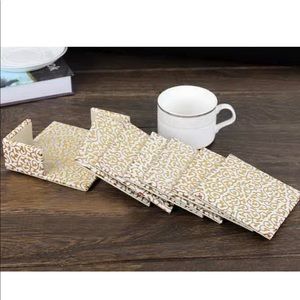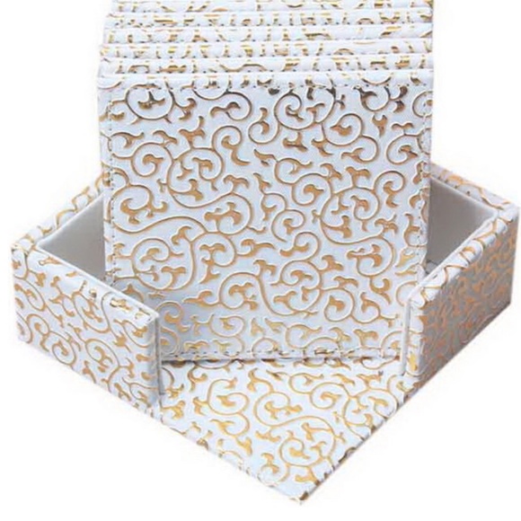 Set of 6 PU Leather Drink Coasters With Holder Square White Gold Flowers Pattern- purchased from Downtown Boutique