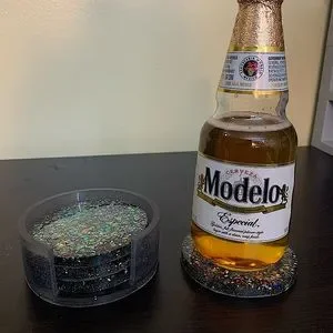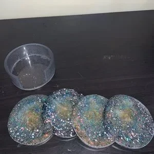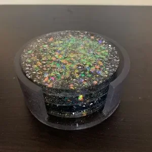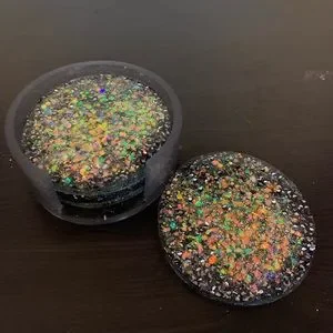 4 round, sparkly homemade coasters with a clear/grey-tinted coaster holder.