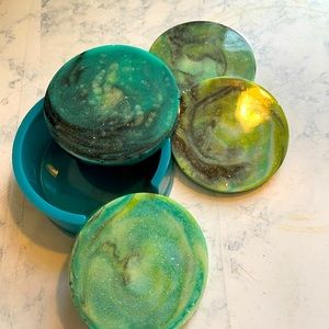 4 coasters with a matching coaster holder