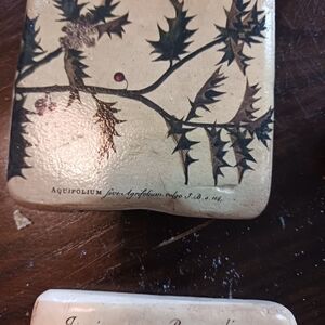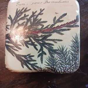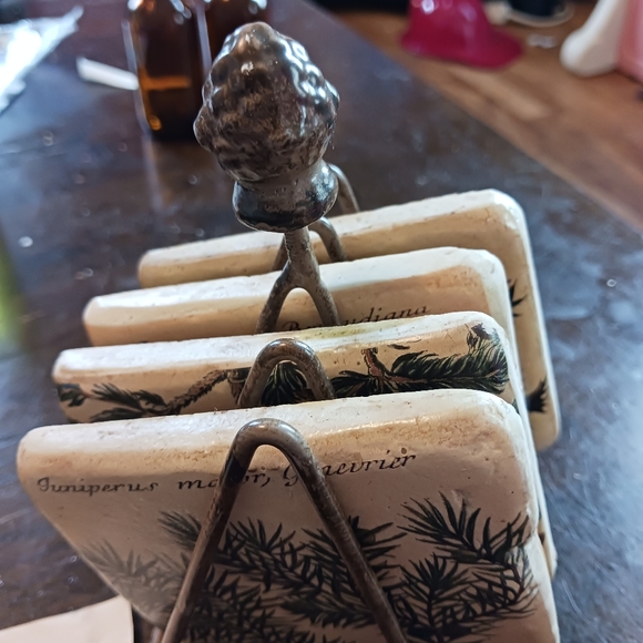 vintage ceramic pune tree coasters. brass frame holder.