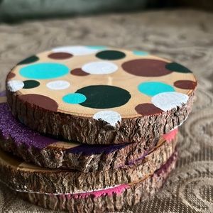 Unique set of birch coasters. Hand made with acrylic paint, and finished with a gloss varnish to prevent damage or staining! Poka dot: white, metallic copper, light turquoise, and hunter green. The top right: metallic gold, coral, navy blue, and white. The bottom left: pansy purple (darkest, topped with dark purple glitter), lilac, hyacinth purple, and eggplant. The bottom right: maroon red, white, metallic rose gold, blush, and fuchsia topped with pretty pink glitter!