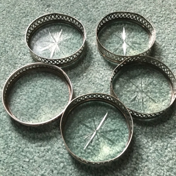 Five glass /sterling coasters. One glass plain. Others etched. One sterling rim slight damage. See photo.