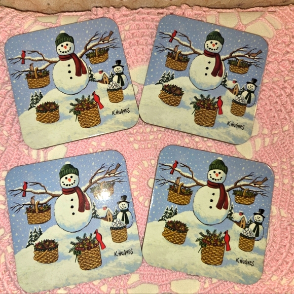 Set of 4 Snowman and Basket cork coasters. Signed by K. Hughes, who was associated with Longaberger. New, never used. 3 1/2 square.