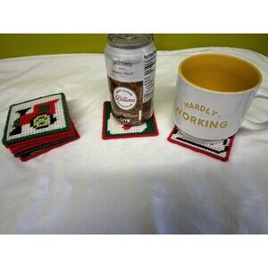Christmas coasters set handmade plastic canvas with felted back. Different Christmas scenes on each one. Pre owned See photos for details as they are part of the description.