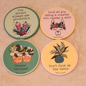 NEW with tags coasters from moonlight makers. The set of 4 coaster includes the following: 1. One should always use protection 2. Look at you using a coaster all classy & sh*t 3. Cheers b*tches! 4. Don't f@ck up the table Coasters feature Moonlight Makers original designs. These 3.5” round coasters have a steel button body and full color graphics on the top. They feature a natural cork backing to protect the table and keep your drink in place. The Water-Resistant Soft-Touch Matte finish increases drink stability. Smoke-free, pet-free home