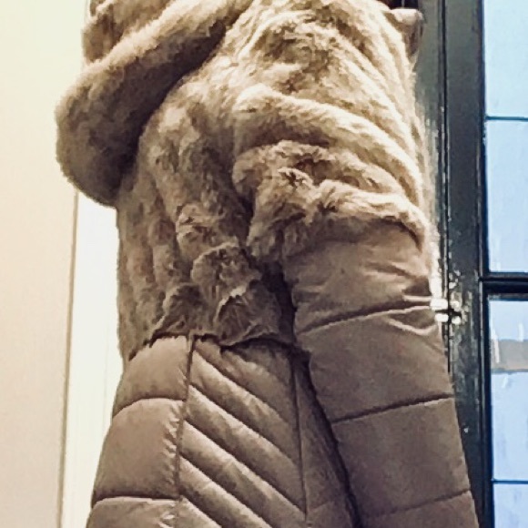 A designer coat with a gold zipper and a faux fur detachable hood