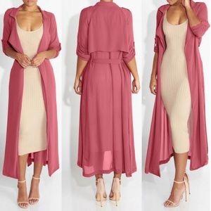 Sheer, trench coat like. Perfect for fall weather.