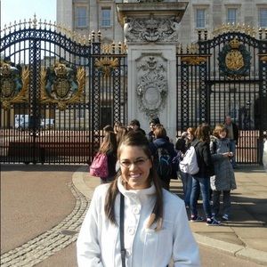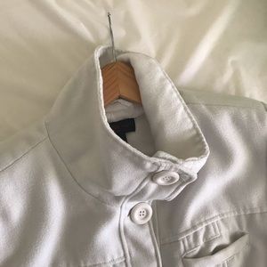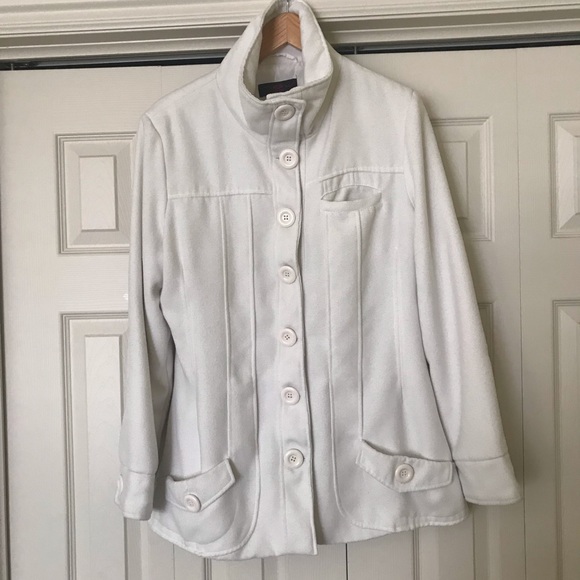 White polyester coat. Worn on vacation only. Haven’t used it since. Light coat.