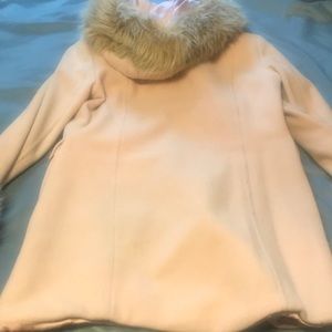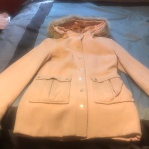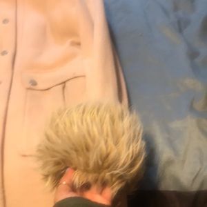 Light pink coat from express. Beige and brown fur on end of sleeves and hood. Hood is removable, the buttons on coat are silver. A few dark worn stains but if dry cleaned may look newer. Normal wear.