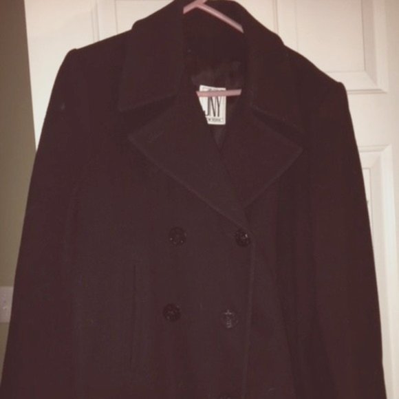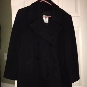 Black 100% wool pea coat; button closure; great condition; can't find size tag but believe it to be a Large (13/14)