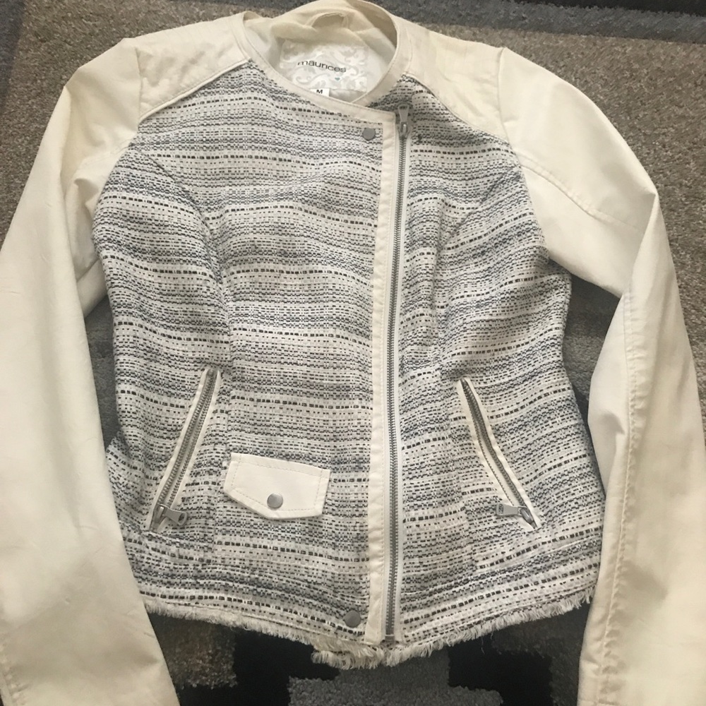White coat. Half cotton / half polyester. Size Med. Worn a couple times. It has two zipper pockets in front.