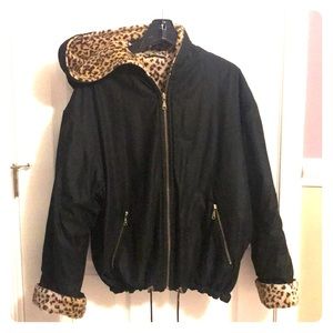 Used black warm jacket with fleecy leopard print on the inside.