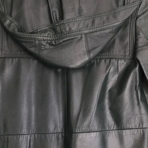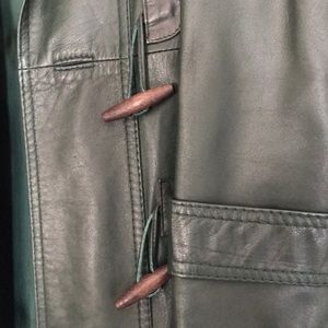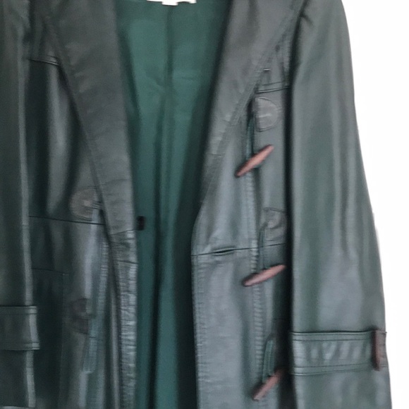 Forest green leather coat with hood attached Has slits in either side From shoulder to bottom of coat is 42”
