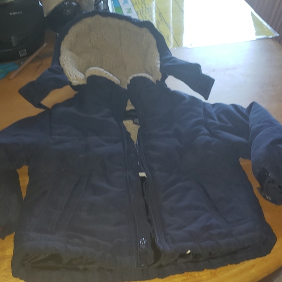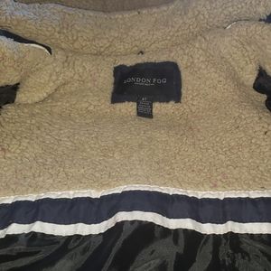 Puffer coat... coat Zippers up to the neck and then the hood has Velcro to close around the neck.. The hood and top of the inside of coat is lined with fur..