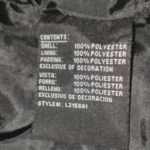The Hood is detachable. The shell ..lining ..padding are all 100% polyester.