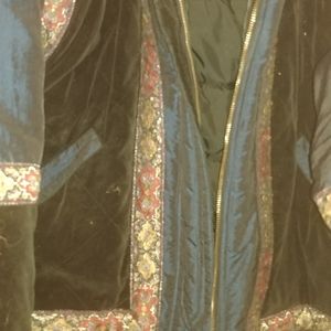Beautiful and unique. Body is black velvet. Arms are polyester/nylon. Trim is beautiful design in gold, red, and green. Collar black velvet. Front zipper. Nylon interior. Thick and warm. Deep front pockets.