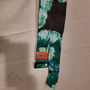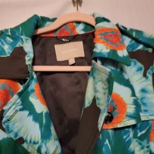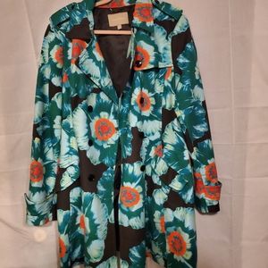 This jacket is a little hard to describe, it looks tye-dyed, with big orange flowers, it comes with a belt