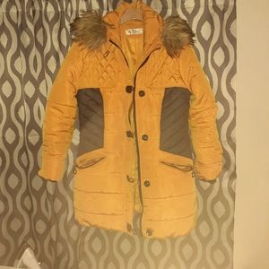 Yellow hooded winter coat .Runs Very small. Fits like a Large NOTE** *****ZIPPER IS BROKEN****