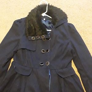 Navy blue wool coat. Has double breast buttons. Black fur collar. Very classy! The tag says L, but fits more like a medium.