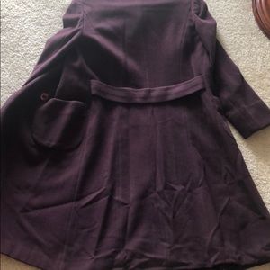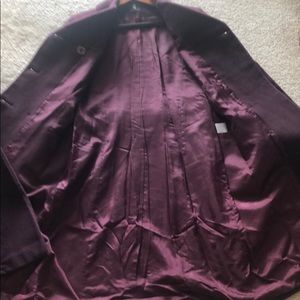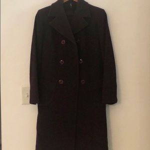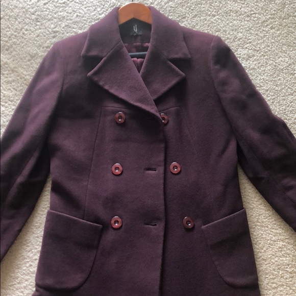 Wool 75%, polyamide 20%, cashmere 5%. Dark burgundy color, very stylish, two pockets, double buttons.